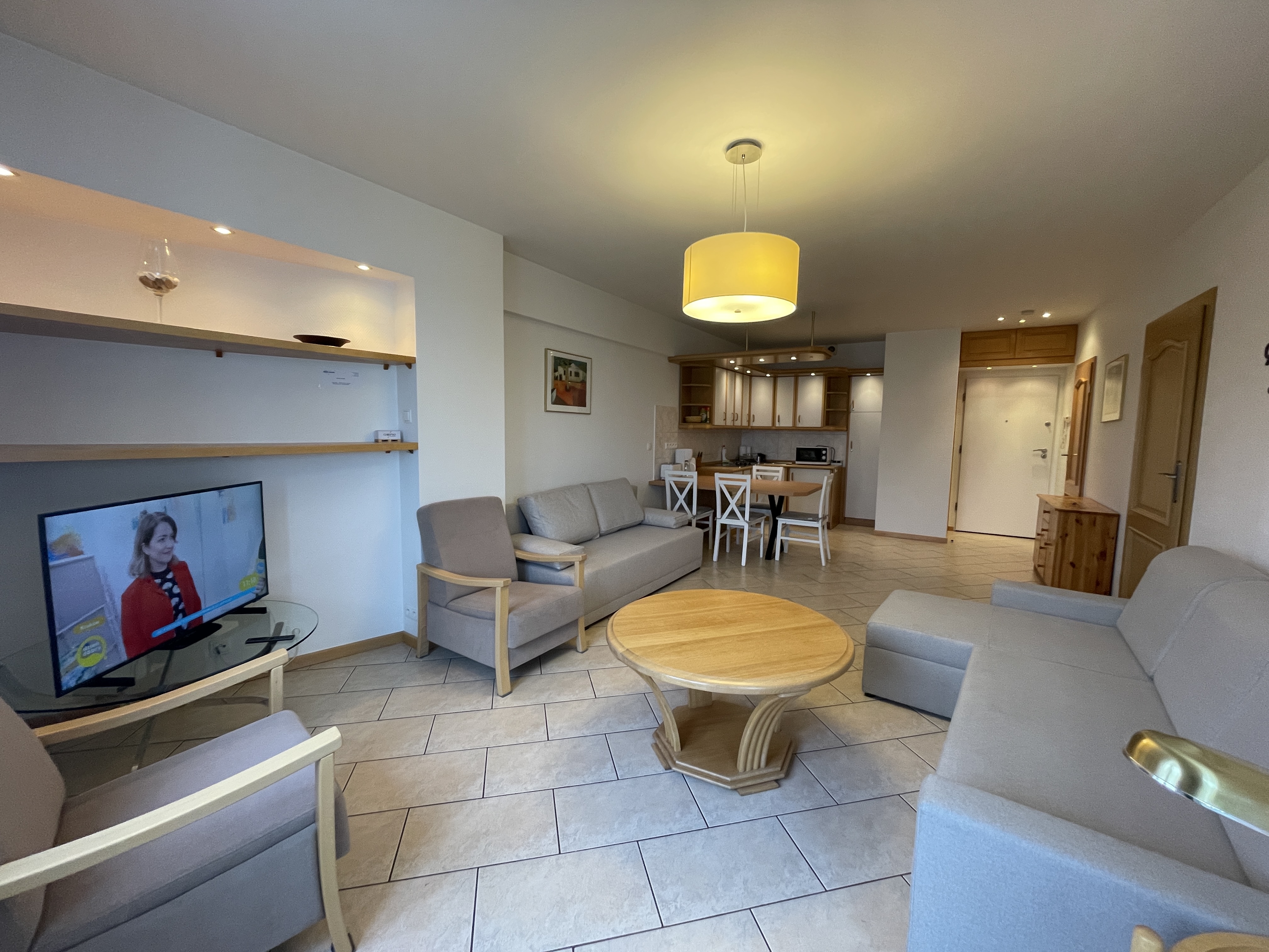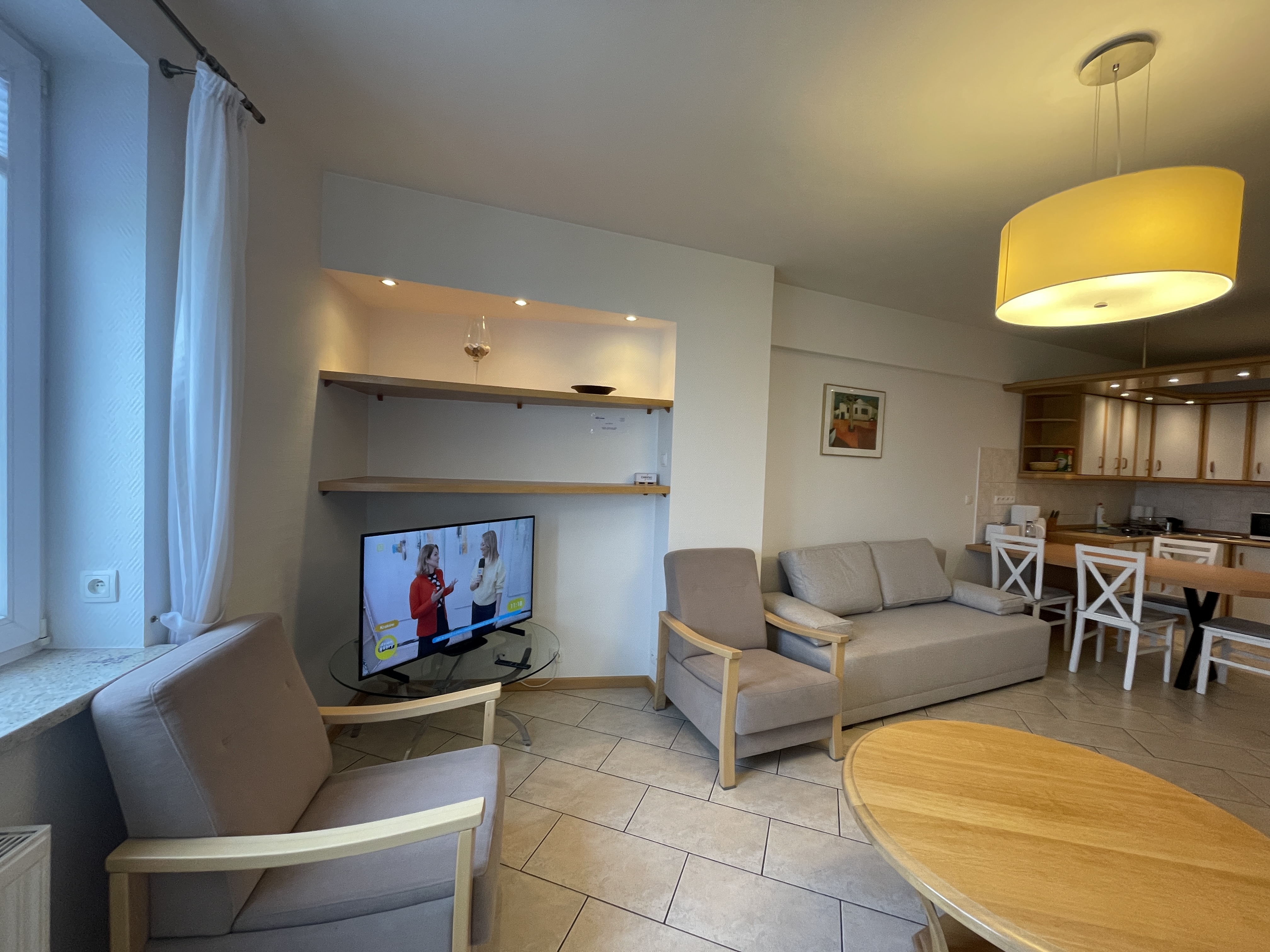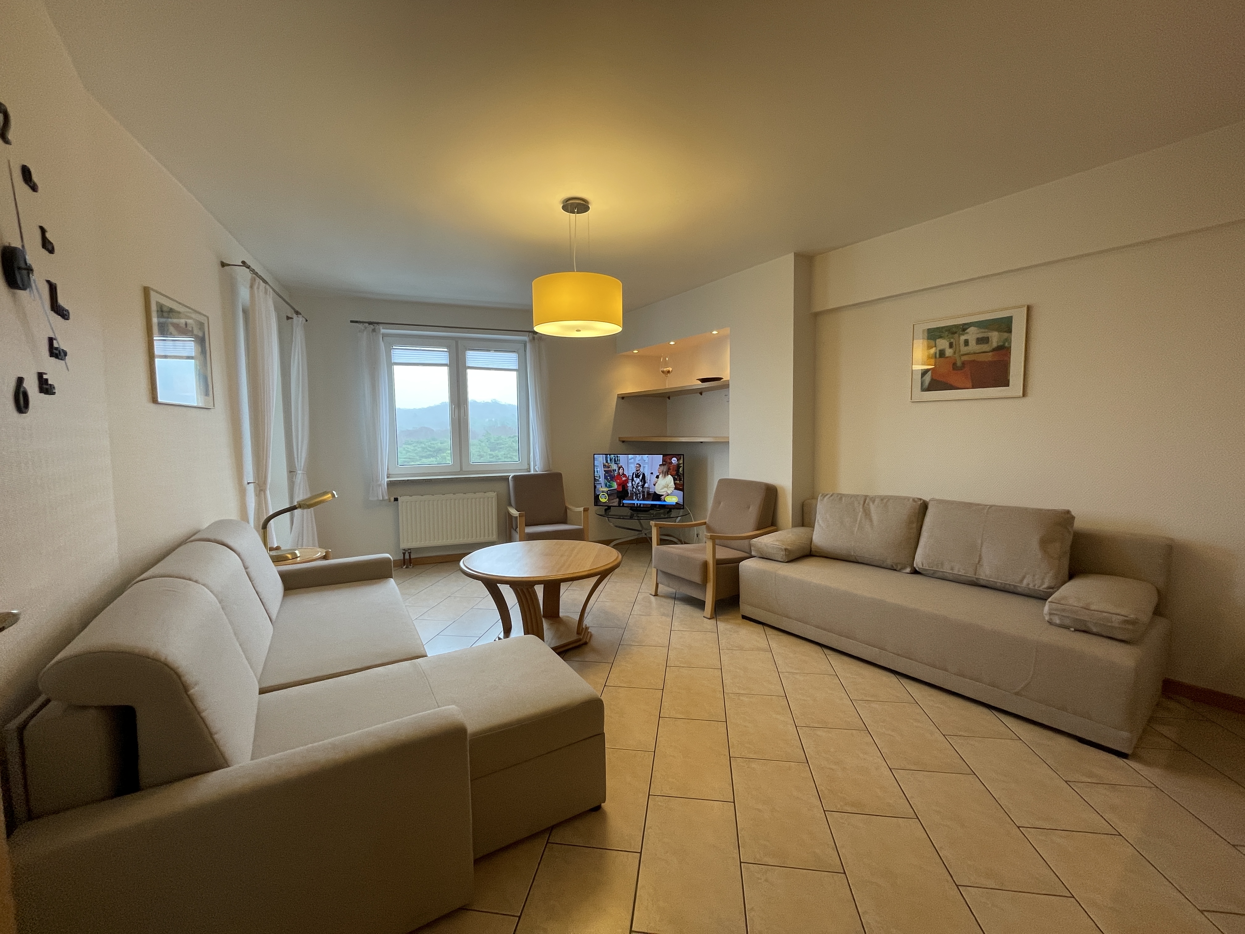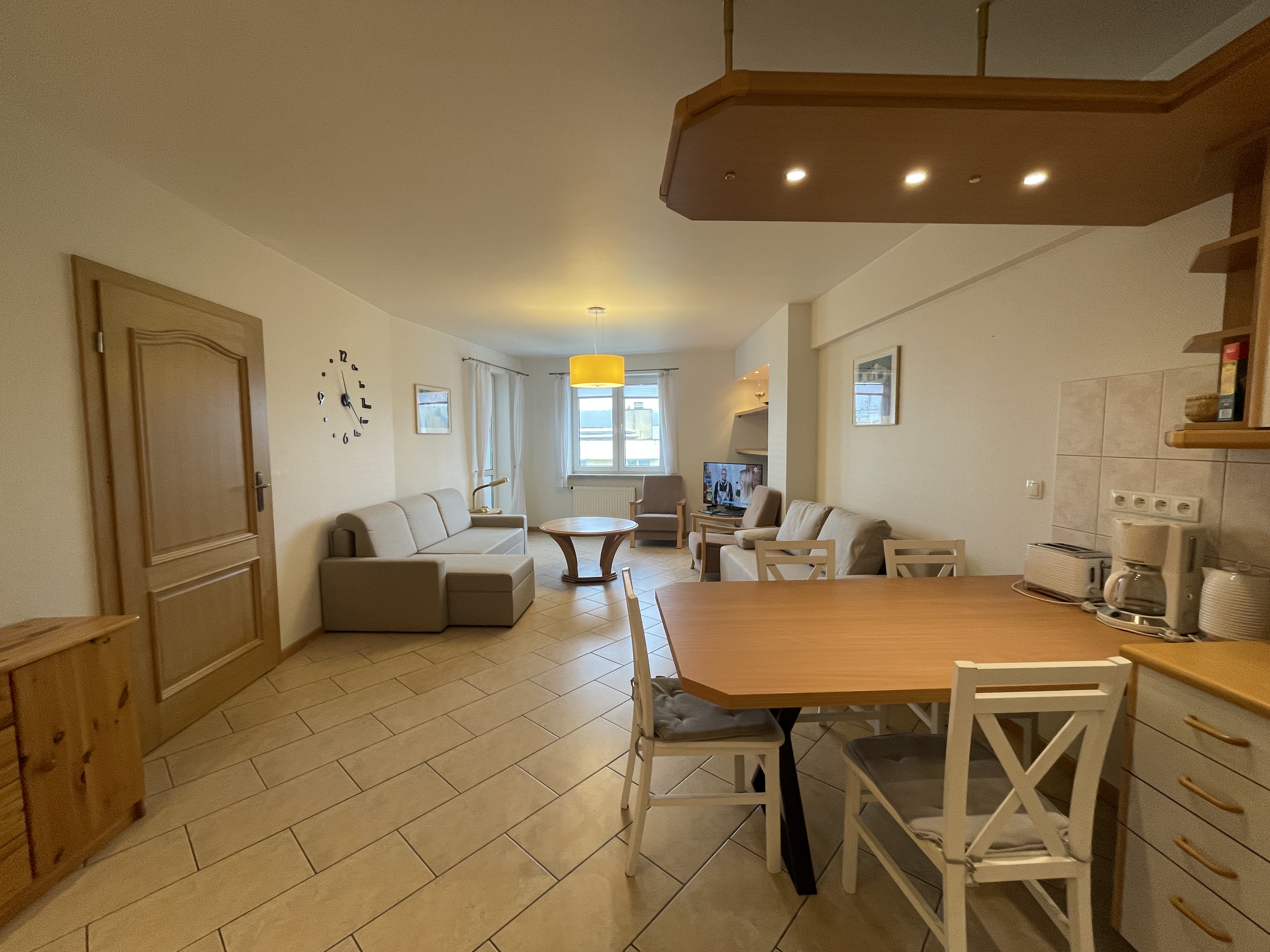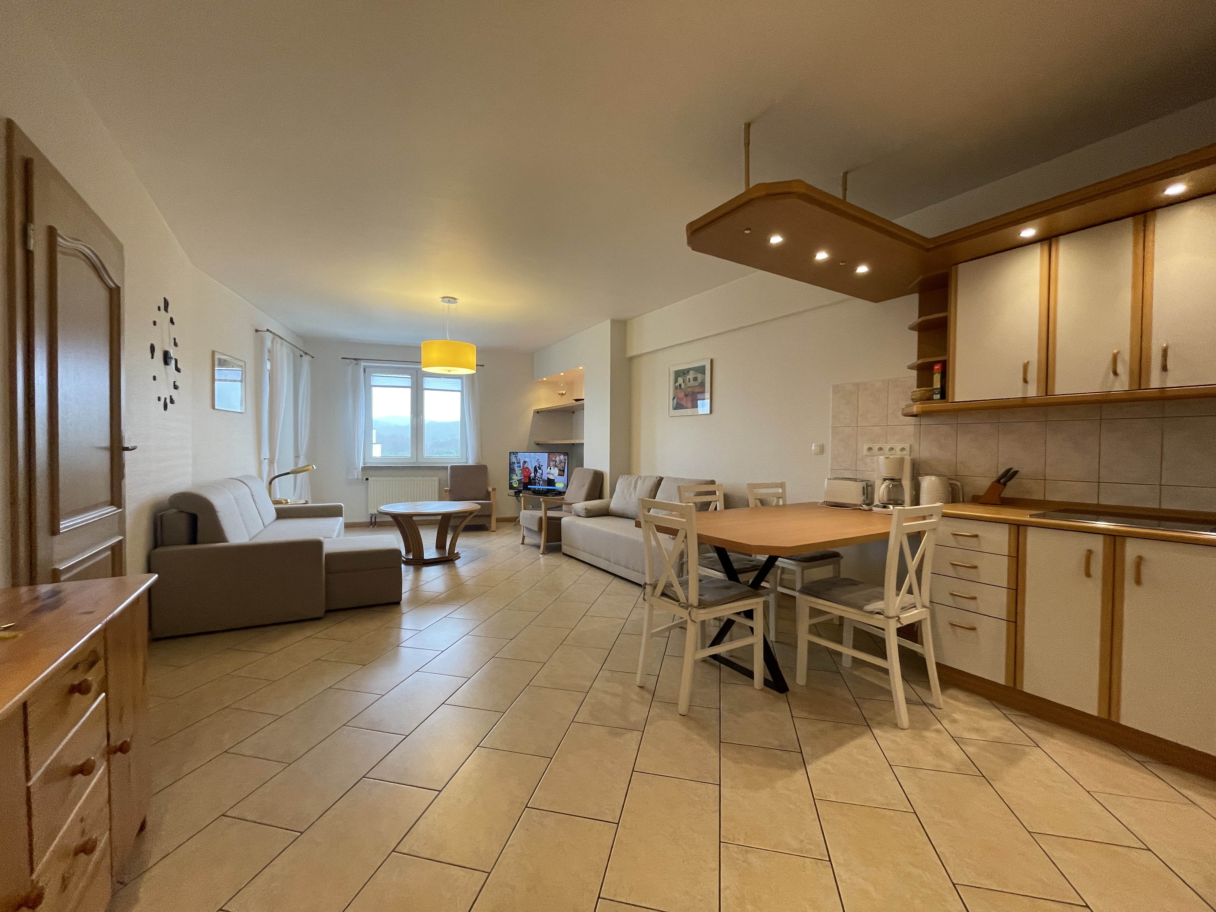 Pokój dzienny : SAT-TV, , dwa  2 –  dwuosobowe kanapo-tapczany z funkcją spania , 2 fotele , garderoba, stół, 4 krzesła