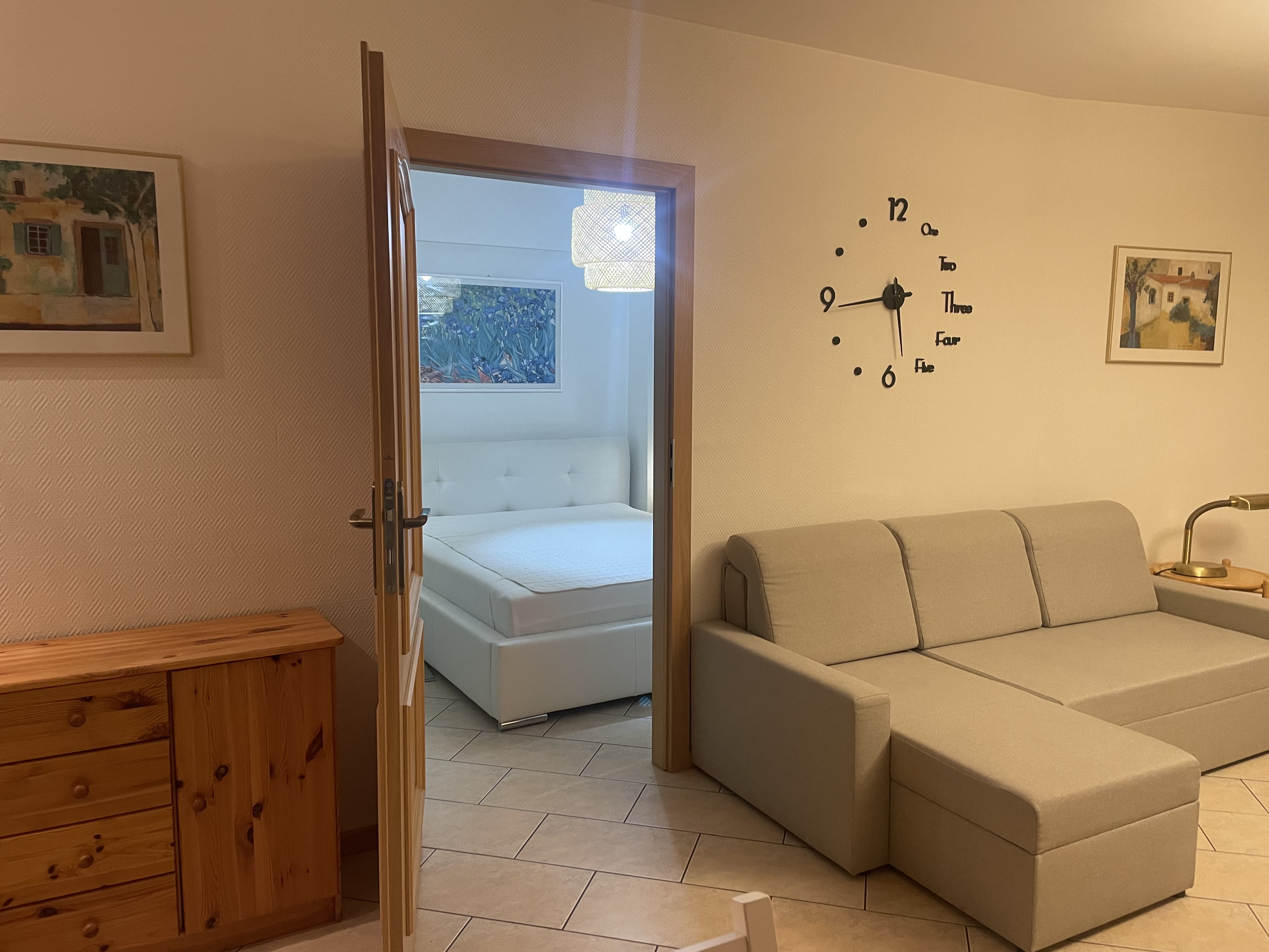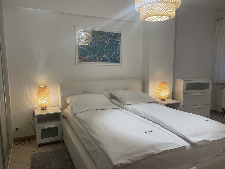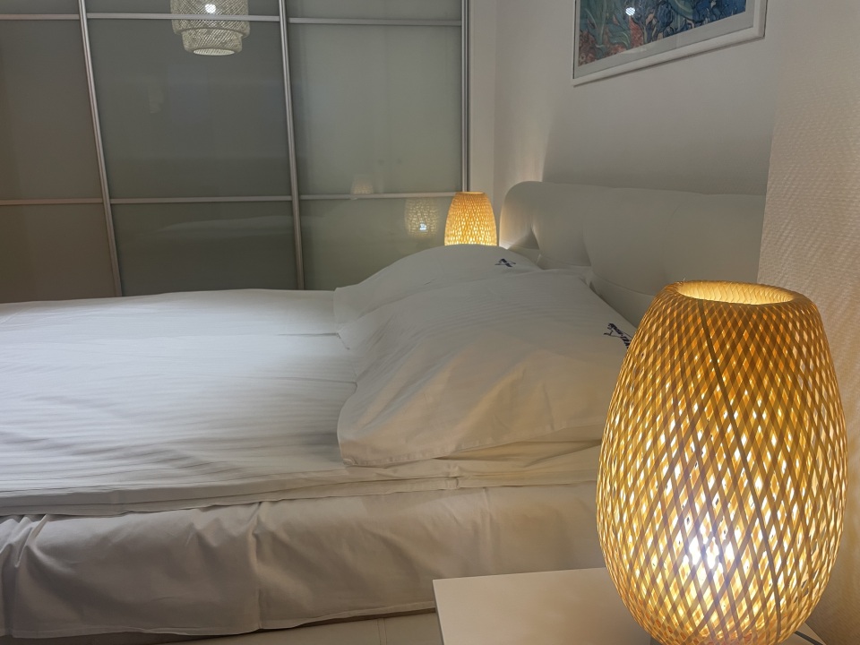 Sypialnia : łoże małżeńskie, duża szafa ubraniowa, szafki nocne, lampki, komoda, -(komplety pościeli)