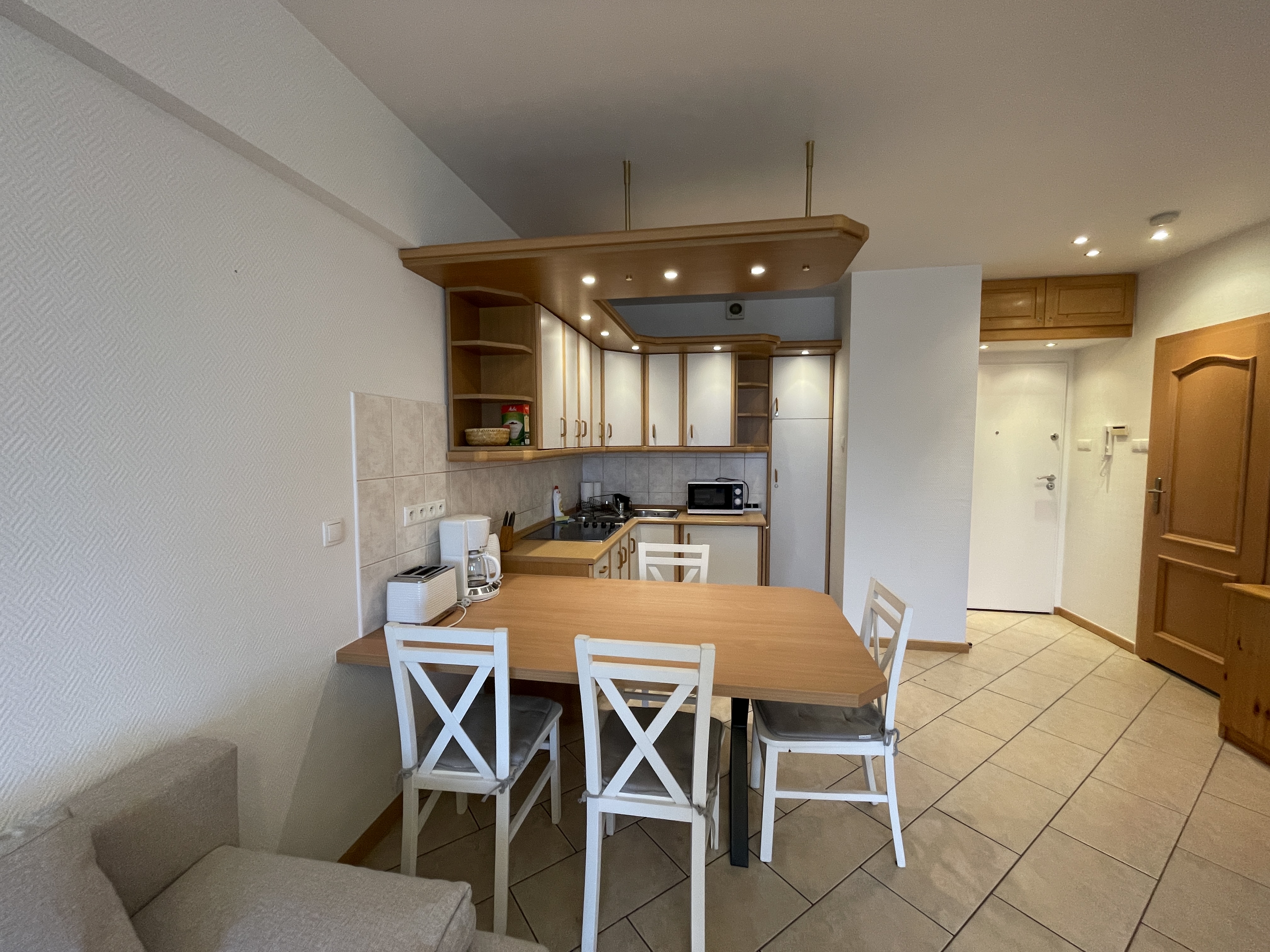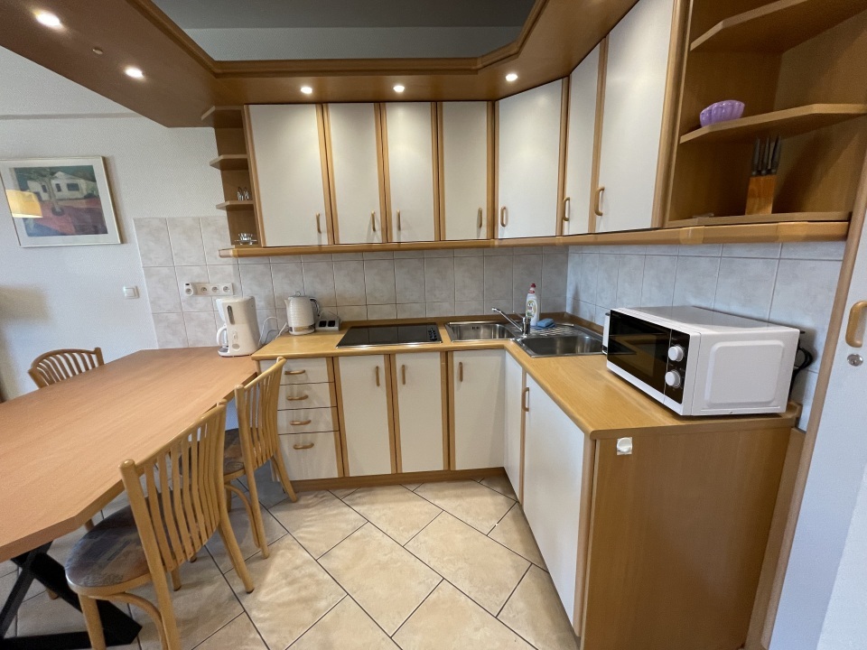 Aneks kuchenny : kompletnie wyposażony – płyta ceramiczna, lodówka,, mikrofalówka, ekspres do kawy, czajnik bezprzewodowy, zlewozmywak, naczynia i sztućce